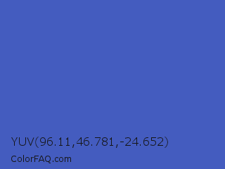 YUV 96.11,46.781,-24.652 Color is a normal blue color and the nearest color is Indigo #4f69c6. Hex code #445cbf and RGB value is rgb(68,92,191). In RGB color space, this color is composed of 27% red, 36% green, 75% blue, In CMYK color space, this color is composed of 64% cyan, 52% magenta, 0% yellow , 25% black , In HSL color space, this color has a hue angle of 228° , 49% saturation and 51% lightness.