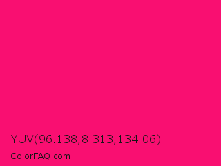 YUV 96.138,8.313,134.06 Color is a normal rose color and the nearest color is Vivid Raspberry #ff006c. Hex code #f90f71 and RGB value is rgb(249,15,113). In RGB color space, this color is composed of 98% red, 6% green, 44% blue, In CMYK color space, this color is composed of 0% cyan, 94% magenta, 55% yellow , 2% black , In HSL color space, this color has a hue angle of 335° , 95% saturation and 52% lightness.