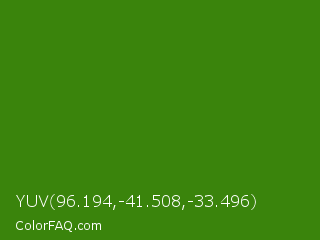 YUV 96.194,-41.508,-33.496 Color is a dark green color and the nearest color is La Palma #368716. Hex code #3a840c and RGB value is rgb(58,132,12). In RGB color space, this color is composed of 23% red, 52% green, 5% blue, In CMYK color space, this color is composed of 56% cyan, 0% magenta, 91% yellow , 48% black , In HSL color space, this color has a hue angle of 97° , 83% saturation and 28% lightness.