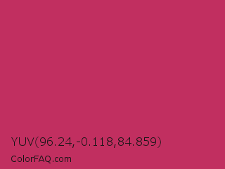 YUV 96.24,-0.118,84.859 Color is a normal rose color and the nearest color is Dingy Dungeon #c53151. Hex code #c12f60 and RGB value is rgb(193,47,96). In RGB color space, this color is composed of 76% red, 18% green, 38% blue, In CMYK color space, this color is composed of 0% cyan, 76% magenta, 50% yellow , 24% black , In HSL color space, this color has a hue angle of 340° , 61% saturation and 47% lightness.