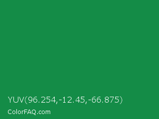 YUV 96.254,-12.45,-66.875 Color is a normal green color and the nearest color is Salem #097f4b. Hex code #148c47 and RGB value is rgb(20,140,71). In RGB color space, this color is composed of 8% red, 55% green, 28% blue, In CMYK color space, this color is composed of 86% cyan, 0% magenta, 49% yellow , 45% black , In HSL color space, this color has a hue angle of 146° , 75% saturation and 31% lightness.