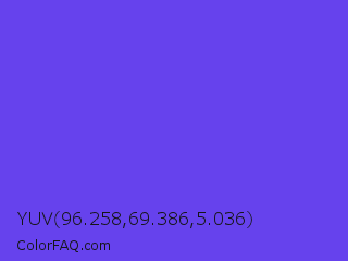 YUV 96.258,69.386,5.036 Color is a normal indigo color and the nearest color is Majorelle Blue #6050dc. Hex code #6642ed and RGB value is rgb(102,66,237). In RGB color space, this color is composed of 40% red, 26% green, 93% blue, In CMYK color space, this color is composed of 57% cyan, 72% magenta, 0% yellow , 7% black , In HSL color space, this color has a hue angle of 253° , 83% saturation and 59% lightness.