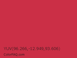 YUV 96.266,-12.949,93.606 Color is a normal red color and the nearest color is French Raspberry #c72c48. Hex code #cb2f46 and RGB value is rgb(203,47,70). In RGB color space, this color is composed of 80% red, 18% green, 27% blue, In CMYK color space, this color is composed of 0% cyan, 77% magenta, 66% yellow , 20% black , In HSL color space, this color has a hue angle of 351° , 62% saturation and 49% lightness.