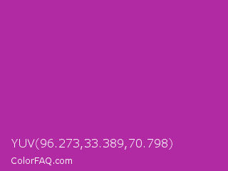 YUV 96.273,33.389,70.798 Color is a normal magenta color and the nearest color is Byzantine #bd33a4. Hex code #b12aa4 and RGB value is rgb(177,42,164). In RGB color space, this color is composed of 69% red, 16% green, 64% blue, In CMYK color space, this color is composed of 0% cyan, 76% magenta, 7% yellow , 31% black , In HSL color space, this color has a hue angle of 306° , 62% saturation and 43% lightness.