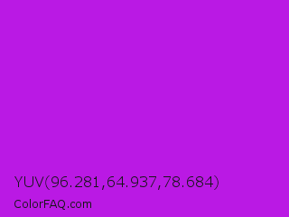 YUV 96.281,64.937,78.684 Color is a normal purple color and the nearest color is Vivid Mulberry #b80ce3. Hex code #ba19e4 and RGB value is rgb(186,25,228). In RGB color space, this color is composed of 73% red, 10% green, 89% blue, In CMYK color space, this color is composed of 18% cyan, 89% magenta, 0% yellow , 11% black , In HSL color space, this color has a hue angle of 288° , 80% saturation and 50% lightness.