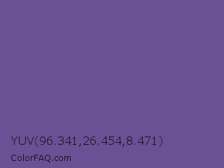 YUV 96.341,26.454,8.471 Color is a normal violet color and the nearest color is Dark Lavender #734f96. Hex code #6a5196 and RGB value is rgb(106,81,150). In RGB color space, this color is composed of 42% red, 32% green, 59% blue, In CMYK color space, this color is composed of 29% cyan, 46% magenta, 0% yellow , 41% black , In HSL color space, this color has a hue angle of 262° , 30% saturation and 45% lightness.