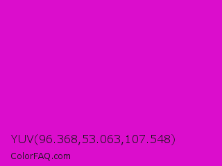 YUV 96.368,53.063,107.548 Color is a normal magenta color and the nearest color is Deep Magenta #cc00cc. Hex code #db0dcc and RGB value is rgb(219,13,204). In RGB color space, this color is composed of 86% red, 5% green, 80% blue, In CMYK color space, this color is composed of 0% cyan, 94% magenta, 7% yellow , 14% black , In HSL color space, this color has a hue angle of 304° , 89% saturation and 45% lightness.