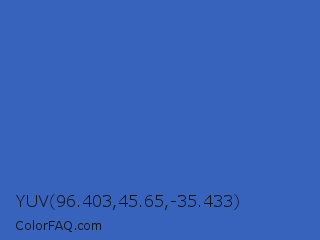 YUV 96.403,45.65,-35.433 Color is a normal blue color and the nearest color is Cerulean Blue #2a52be. Hex code #3863bd and RGB value is rgb(56,99,189). In RGB color space, this color is composed of 22% red, 39% green, 74% blue, In CMYK color space, this color is composed of 70% cyan, 48% magenta, 0% yellow , 26% black , In HSL color space, this color has a hue angle of 221° , 54% saturation and 48% lightness.
