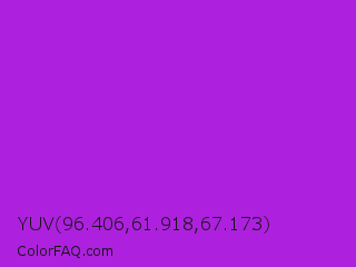 YUV 96.406,61.918,67.173 Color is a normal purple color and the nearest color is Veronica #a020f0. Hex code #ad21de and RGB value is rgb(173,33,222). In RGB color space, this color is composed of 68% red, 13% green, 87% blue, In CMYK color space, this color is composed of 22% cyan, 85% magenta, 0% yellow , 13% black , In HSL color space, this color has a hue angle of 284° , 74% saturation and 50% lightness.