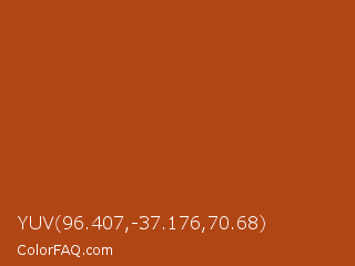 YUV 96.407,-37.176,70.68 Color is a normal orange color and the nearest color is Rust #b7410e. Hex code #b14615 and RGB value is rgb(177,70,21). In RGB color space, this color is composed of 69% red, 27% green, 8% blue, In CMYK color space, this color is composed of 0% cyan, 60% magenta, 88% yellow , 31% black , In HSL color space, this color has a hue angle of 19° , 79% saturation and 39% lightness.