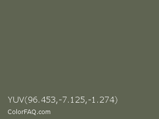 YUV 96.453,-7.125,-1.274 Color is a normal lime color and the nearest color is Siam #646a54. Hex code #5f6452 and RGB value is rgb(95,100,82). In RGB color space, this color is composed of 37% red, 39% green, 32% blue, In CMYK color space, this color is composed of 5% cyan, 0% magenta, 18% yellow , 61% black , In HSL color space, this color has a hue angle of 77° , 10% saturation and 36% lightness.