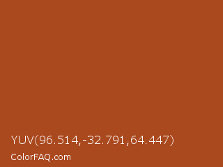 YUV 96.514,-32.791,64.447 Color is a normal orange color and the nearest color is Chinese Red #aa381e. Hex code #aa481e and RGB value is rgb(170,72,30). In RGB color space, this color is composed of 67% red, 28% green, 12% blue, In CMYK color space, this color is composed of 0% cyan, 58% magenta, 82% yellow , 33% black , In HSL color space, this color has a hue angle of 18° , 70% saturation and 39% lightness.