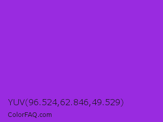 YUV 96.524,62.846,49.529 Color is a normal purple color and the nearest color is Blue Violet #8a2be2. Hex code #992be0 and RGB value is rgb(153,43,224). In RGB color space, this color is composed of 60% red, 17% green, 88% blue, In CMYK color space, this color is composed of 32% cyan, 81% magenta, 0% yellow , 12% black , In HSL color space, this color has a hue angle of 276° , 74% saturation and 52% lightness.