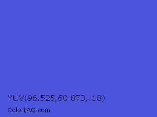 YUV 96.525,60.873,-18 Color is a normal blue color and the nearest color is Iris #5a4fcf. Hex code #4c53dc and RGB value is rgb(76,83,220). In RGB color space, this color is composed of 30% red, 33% green, 86% blue, In CMYK color space, this color is composed of 65% cyan, 62% magenta, 0% yellow , 14% black , In HSL color space, this color has a hue angle of 237° , 67% saturation and 58% lightness.