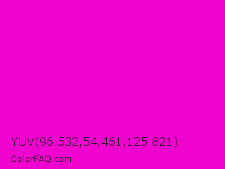 YUV 96.532,54.461,125.821 Color is a normal magenta color and the nearest color is Purple Pizzazz #ff00cc. Hex code #f002cf and RGB value is rgb(240,2,207). In RGB color space, this color is composed of 94% red, 1% green, 81% blue, In CMYK color space, this color is composed of 0% cyan, 99% magenta, 14% yellow , 6% black , In HSL color space, this color has a hue angle of 308° , 98% saturation and 47% lightness.