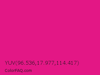 YUV 96.536,17.977,114.417 Color is a normal rose color and the nearest color is Vivid Cerise #da1d81. Hex code #e31785 and RGB value is rgb(227,23,133). In RGB color space, this color is composed of 89% red, 9% green, 52% blue, In CMYK color space, this color is composed of 0% cyan, 90% magenta, 41% yellow , 11% black , In HSL color space, this color has a hue angle of 328° , 82% saturation and 49% lightness.