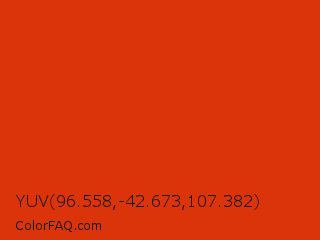 YUV 96.558,-42.673,107.382 Color is a normal red color and the nearest color is Vermilion #d9381e. Hex code #db330a and RGB value is rgb(219,51,10). In RGB color space, this color is composed of 86% red, 20% green, 4% blue, In CMYK color space, this color is composed of 0% cyan, 77% magenta, 95% yellow , 14% black , In HSL color space, this color has a hue angle of 12° , 91% saturation and 45% lightness.