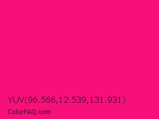 YUV 96.566,12.539,131.931 Color is a normal rose color and the nearest color is Winter Sky #ff007c. Hex code #f70f7a and RGB value is rgb(247,15,122). In RGB color space, this color is composed of 97% red, 6% green, 48% blue, In CMYK color space, this color is composed of 0% cyan, 94% magenta, 51% yellow , 3% black , In HSL color space, this color has a hue angle of 332° , 94% saturation and 51% lightness.