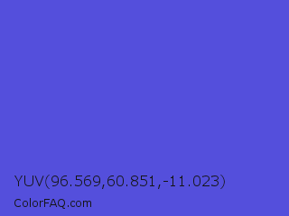 YUV 96.569,60.851,-11.023 Color is a normal indigo color and the nearest color is Majorelle Blue #6050dc. Hex code #544fdc and RGB value is rgb(84,79,220). In RGB color space, this color is composed of 33% red, 31% green, 86% blue, In CMYK color space, this color is composed of 62% cyan, 64% magenta, 0% yellow , 14% black , In HSL color space, this color has a hue angle of 242° , 67% saturation and 59% lightness.