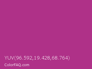 YUV 96.592,19.428,68.764 Color is a normal magenta color and the nearest color is Fandango #b53389. Hex code #af3188 and RGB value is rgb(175,49,136). In RGB color space, this color is composed of 69% red, 19% green, 53% blue, In CMYK color space, this color is composed of 0% cyan, 72% magenta, 22% yellow , 31% black , In HSL color space, this color has a hue angle of 319° , 56% saturation and 44% lightness.