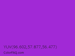 YUV 96.602,57.877,56.477 Color is a normal purple color and the nearest color is Dark Orchid #9932cc. Hex code #a129d6 and RGB value is rgb(161,41,214). In RGB color space, this color is composed of 63% red, 16% green, 84% blue, In CMYK color space, this color is composed of 25% cyan, 81% magenta, 0% yellow , 16% black , In HSL color space, this color has a hue angle of 282° , 68% saturation and 50% lightness.