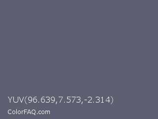 YUV 96.639,7.573,-2.314 Color is a normal blue color and the nearest color is Mid Gray #5f5f6e. Hex code #5e5f70 and RGB value is rgb(94,95,112). In RGB color space, this color is composed of 37% red, 37% green, 44% blue, In CMYK color space, this color is composed of 16% cyan, 15% magenta, 0% yellow , 56% black , In HSL color space, this color has a hue angle of 237° , 9% saturation and 40% lightness.