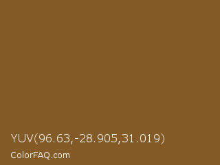 YUV 96.63,-28.905,31.019 Color is a normal orange color and the nearest color is Kumera #886221. Hex code #845a26 and RGB value is rgb(132,90,38). In RGB color space, this color is composed of 52% red, 35% green, 15% blue, In CMYK color space, this color is composed of 0% cyan, 32% magenta, 71% yellow , 48% black , In HSL color space, this color has a hue angle of 33° , 55% saturation and 33% lightness.