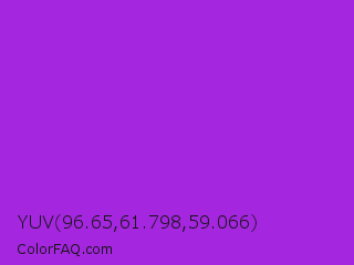 YUV 96.65,61.798,59.066 Color is a normal purple color and the nearest color is Veronica #a020f0. Hex code #a426de and RGB value is rgb(164,38,222). In RGB color space, this color is composed of 64% red, 15% green, 87% blue, In CMYK color space, this color is composed of 26% cyan, 83% magenta, 0% yellow , 13% black , In HSL color space, this color has a hue angle of 281° , 74% saturation and 51% lightness.