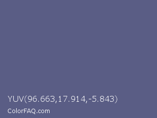 YUV 96.663,17.914,-5.843 Color is a normal blue color and the nearest color is Comet #5c5d75. Hex code #5a5d85 and RGB value is rgb(90,93,133). In RGB color space, this color is composed of 35% red, 36% green, 52% blue, In CMYK color space, this color is composed of 32% cyan, 30% magenta, 0% yellow , 48% black , In HSL color space, this color has a hue angle of 236° , 19% saturation and 44% lightness.