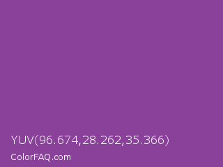 YUV 96.674,28.262,35.366 Color is a normal purple color and the nearest color is Vivid Violet #803790. Hex code #89419a and RGB value is rgb(137,65,154). In RGB color space, this color is composed of 54% red, 25% green, 60% blue, In CMYK color space, this color is composed of 11% cyan, 58% magenta, 0% yellow , 40% black , In HSL color space, this color has a hue angle of 289° , 41% saturation and 43% lightness.