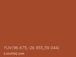 YUV 96.675,-26.955,59.044 Color is a normal color and the nearest color is Paarl #a65529. Hex code #a4492a and RGB value is rgb(164,73,42). In RGB color space, this color is composed of 64% red, 29% green, 16% blue, In CMYK color space, this color is composed of 0% cyan, 55% magenta, 74% yellow , 36% black , In HSL color space, this color has a hue angle of 15° , 59% saturation and 40% lightness.