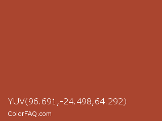 YUV 96.691,-24.498,64.292 Color is a normal red color and the nearest color is Medium Carmine #af4035. Hex code #aa452f and RGB value is rgb(170,69,47). In RGB color space, this color is composed of 67% red, 27% green, 18% blue, In CMYK color space, this color is composed of 0% cyan, 59% magenta, 72% yellow , 33% black , In HSL color space, this color has a hue angle of 11° , 57% saturation and 43% lightness.