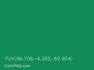 YUV 96.708,-4.293,-69.904 Color is a normal green color and the nearest color is Deep Green Cyan Turquoise #0e7c61. Hex code #118b58 and RGB value is rgb(17,139,88). In RGB color space, this color is composed of 7% red, 55% green, 35% blue, In CMYK color space, this color is composed of 88% cyan, 0% magenta, 37% yellow , 45% black , In HSL color space, this color has a hue angle of 155° , 78% saturation and 31% lightness.