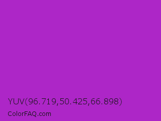 YUV 96.719,50.425,66.898 Color is a normal purple color and the nearest color is Dark Orchid #9932cc. Hex code #ad26c7 and RGB value is rgb(173,38,199). In RGB color space, this color is composed of 68% red, 15% green, 78% blue, In CMYK color space, this color is composed of 13% cyan, 81% magenta, 0% yellow , 22% black , In HSL color space, this color has a hue angle of 290° , 68% saturation and 46% lightness.