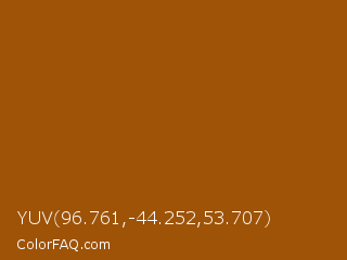YUV 96.761,-44.252,53.707 Color is a normal orange color and the nearest color is Chelsea Gem #9e5302. Hex code #9e5307 and RGB value is rgb(158,83,7). In RGB color space, this color is composed of 62% red, 33% green, 3% blue, In CMYK color space, this color is composed of 0% cyan, 47% magenta, 96% yellow , 38% black , In HSL color space, this color has a hue angle of 30° , 92% saturation and 32% lightness.