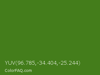 YUV 96.785,-34.404,-25.244 Color is a dark green color and the nearest color is La Palma #368716. Hex code #447d1b and RGB value is rgb(68,125,27). In RGB color space, this color is composed of 27% red, 49% green, 11% blue, In CMYK color space, this color is composed of 46% cyan, 0% magenta, 78% yellow , 51% black , In HSL color space, this color has a hue angle of 95° , 64% saturation and 30% lightness.