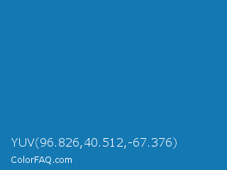 YUV 96.826,40.512,-67.376 Color is a normal blue color and the nearest color is Green Blue #1164b4. Hex code #1478b3 and RGB value is rgb(20,120,179). In RGB color space, this color is composed of 8% red, 47% green, 70% blue, In CMYK color space, this color is composed of 89% cyan, 33% magenta, 0% yellow , 30% black , In HSL color space, this color has a hue angle of 202° , 80% saturation and 39% lightness.