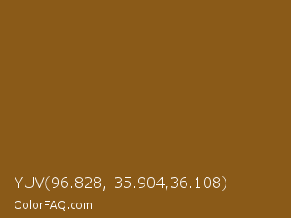 YUV 96.828,-35.904,36.108 Color is a normal orange color and the nearest color is Grizzly #885818. Hex code #8a5a18 and RGB value is rgb(138,90,24). In RGB color space, this color is composed of 54% red, 35% green, 9% blue, In CMYK color space, this color is composed of 0% cyan, 35% magenta, 83% yellow , 46% black , In HSL color space, this color has a hue angle of 35° , 70% saturation and 32% lightness.