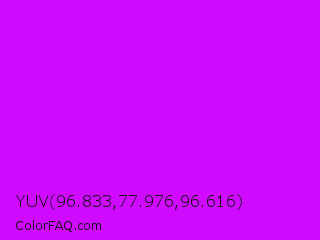 YUV 96.833,77.976,96.616 Color is a normal purple color and the nearest color is Vivid Orchid #cc00ff. Hex code #cf0aff and RGB value is rgb(207,10,255). In RGB color space, this color is composed of 81% red, 4% green, 100% blue, In CMYK color space, this color is composed of 19% cyan, 96% magenta, 0% yellow , 0% black , In HSL color space, this color has a hue angle of 288° , 100% saturation and 52% lightness.