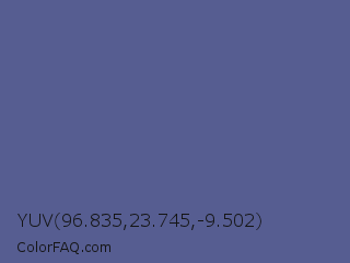 YUV 96.835,23.745,-9.502 Color is a normal blue color and the nearest color is UCLA Blue #536895. Hex code #565d91 and RGB value is rgb(86,93,145). In RGB color space, this color is composed of 34% red, 36% green, 57% blue, In CMYK color space, this color is composed of 41% cyan, 36% magenta, 0% yellow , 43% black , In HSL color space, this color has a hue angle of 233° , 26% saturation and 45% lightness.