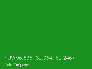 YUV 96.836,-31.964,-61.246 Color is a normal green color and the nearest color is Forest Green #228b22. Hex code #1b9120 and RGB value is rgb(27,145,32). In RGB color space, this color is composed of 11% red, 57% green, 13% blue, In CMYK color space, this color is composed of 81% cyan, 0% magenta, 78% yellow , 43% black , In HSL color space, this color has a hue angle of 123° , 69% saturation and 34% lightness.