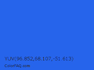 YUV 96.852,68.107,-51.613 Color is a normal blue color and the nearest color is Blue Crayola #1f75fe. Hex code #2664eb and RGB value is rgb(38,100,235). In RGB color space, this color is composed of 15% red, 39% green, 92% blue, In CMYK color space, this color is composed of 84% cyan, 57% magenta, 0% yellow , 8% black , In HSL color space, this color has a hue angle of 221° , 83% saturation and 54% lightness.