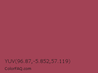 YUV 96.87,-5.852,57.119 Color is a normal red color and the nearest color is English Red #ab4b52. Hex code #a24255 and RGB value is rgb(162,66,85). In RGB color space, this color is composed of 64% red, 26% green, 33% blue, In CMYK color space, this color is composed of 0% cyan, 59% magenta, 48% yellow , 36% black , In HSL color space, this color has a hue angle of 348° , 42% saturation and 45% lightness.