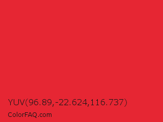 YUV 96.89,-22.624,116.737 Color is a normal red color and the nearest color is Alizarin Crimson #e32636. Hex code #e62633 and RGB value is rgb(230,38,51). In RGB color space, this color is composed of 90% red, 15% green, 20% blue, In CMYK color space, this color is composed of 0% cyan, 83% magenta, 78% yellow , 10% black , In HSL color space, this color has a hue angle of 356° , 79% saturation and 53% lightness.