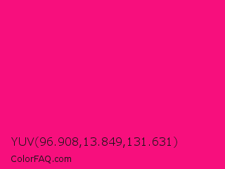 YUV 96.908,13.849,131.631 Color is a normal rose color and the nearest color is Winter Sky #ff007c. Hex code #f70f7d and RGB value is rgb(247,15,125). In RGB color space, this color is composed of 97% red, 6% green, 49% blue, In CMYK color space, this color is composed of 0% cyan, 94% magenta, 49% yellow , 3% black , In HSL color space, this color has a hue angle of 332° , 94% saturation and 51% lightness.