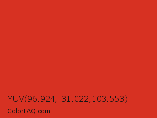 YUV 96.924,-31.022,103.553 Color is a normal red color and the nearest color is Vermilion #d9381e. Hex code #d73122 and RGB value is rgb(215,49,34). In RGB color space, this color is composed of 84% red, 19% green, 13% blue, In CMYK color space, this color is composed of 0% cyan, 77% magenta, 84% yellow , 16% black , In HSL color space, this color has a hue angle of 5° , 73% saturation and 49% lightness.
