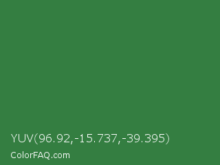 YUV 96.92,-15.737,-39.395 Color is a normal green color and the nearest color is Goblin #3d7d52. Hex code #347e41 and RGB value is rgb(52,126,65). In RGB color space, this color is composed of 20% red, 49% green, 25% blue, In CMYK color space, this color is composed of 59% cyan, 0% magenta, 48% yellow , 51% black , In HSL color space, this color has a hue angle of 131° , 42% saturation and 35% lightness.