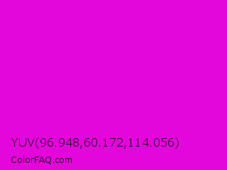 YUV 96.948,60.172,114.056 Color is a normal magenta color and the nearest color is Deep Magenta #cc00cc. Hex code #e307db and RGB value is rgb(227,7,219). In RGB color space, this color is composed of 89% red, 3% green, 86% blue, In CMYK color space, this color is composed of 0% cyan, 97% magenta, 4% yellow , 11% black , In HSL color space, this color has a hue angle of 302° , 94% saturation and 46% lightness.