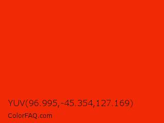 YUV 96.995,-45.354,127.169 Color is a normal red color and the nearest color is Ferrari Red #ff2800. Hex code #f22905 and RGB value is rgb(242,41,5). In RGB color space, this color is composed of 95% red, 16% green, 2% blue, In CMYK color space, this color is composed of 0% cyan, 83% magenta, 98% yellow , 5% black , In HSL color space, this color has a hue angle of 9° , 96% saturation and 48% lightness.