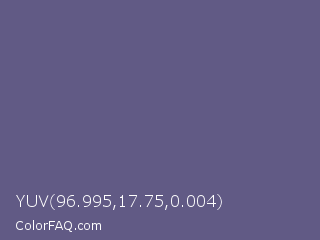 YUV 96.995,17.75,0.004 Color is a normal indigo color and the nearest color is Dolphin #646077. Hex code #615a85 and RGB value is rgb(97,90,133). In RGB color space, this color is composed of 38% red, 35% green, 52% blue, In CMYK color space, this color is composed of 27% cyan, 32% magenta, 0% yellow , 48% black , In HSL color space, this color has a hue angle of 250° , 19% saturation and 44% lightness.